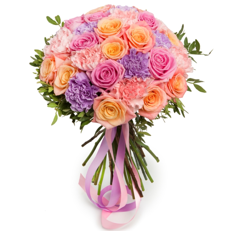 Букет состоит из 21 роза, 18 гвоздик, зелень, прозрачная упаковка, атласная лента.
