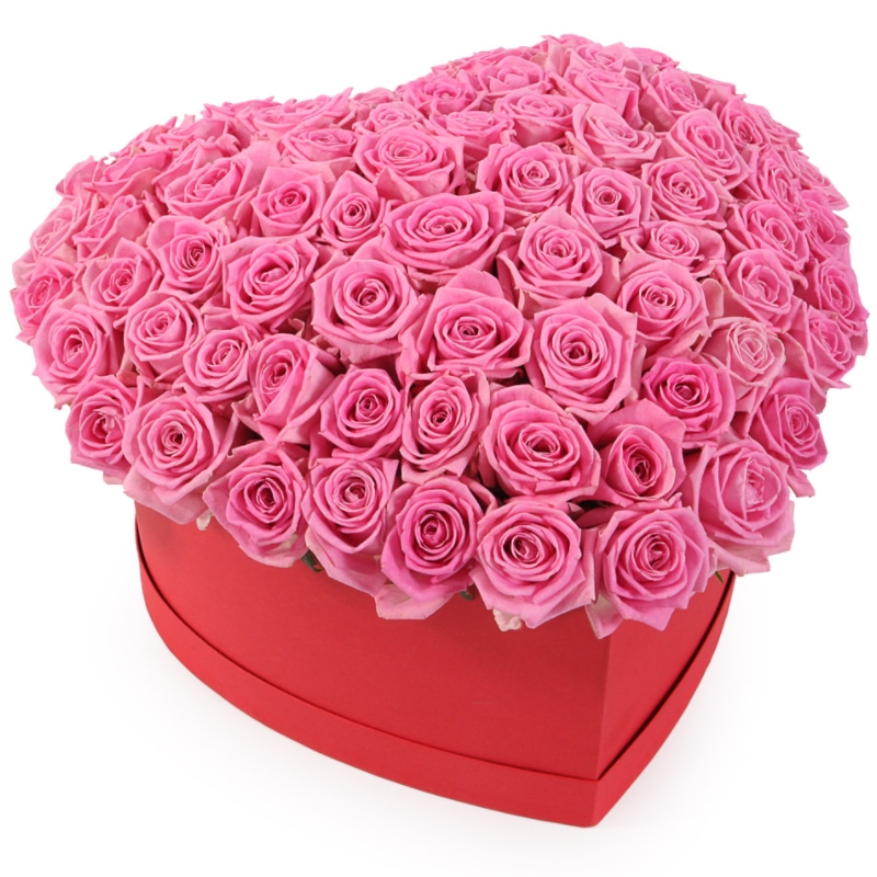 51 розовая роза, коробка в виде сердца.