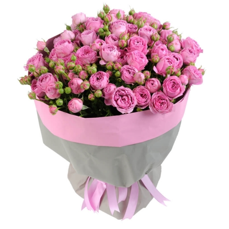 Букет состоит из 15 кустовых роз, упаковка, лента.