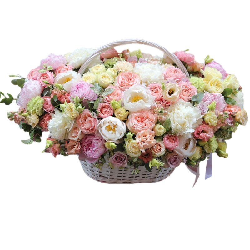 Букет состоит из 20 пионов, 11 пионовидных роз, 9 кустовых роз, 7 пионовидных кустовых роз, 7 веток эустомы, 5 альстромерий, 7 гвоздик, зелень, корзина, оазис.
